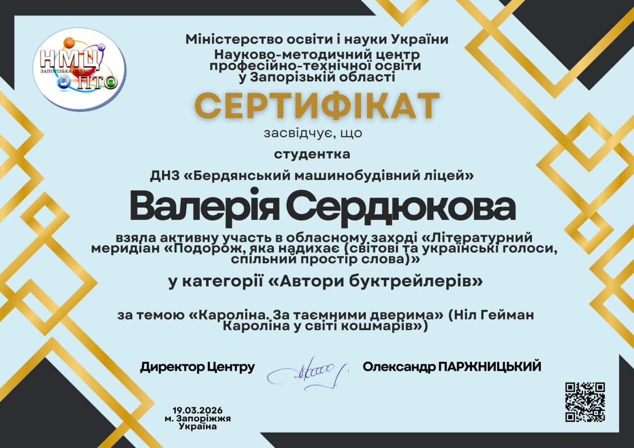 19 березня 2026 року представники ДНЗ “Бердянський машинобудівний професійний ліцей” доєдналися до літературного меридіану «Подорож, яка надихає (світові та українські голоси, спільний простір слова)» організованого науково-методичним центром професійно-технічної освіти у Запорізькій області. Захід проведено з метою формування читацької культури студентів, розвитку індивідуальних творчих здібностей, їх естетичних смаків, закріплення громадянської та морально світоглядної позиції на матеріалі творів сучасної художньої літератури.