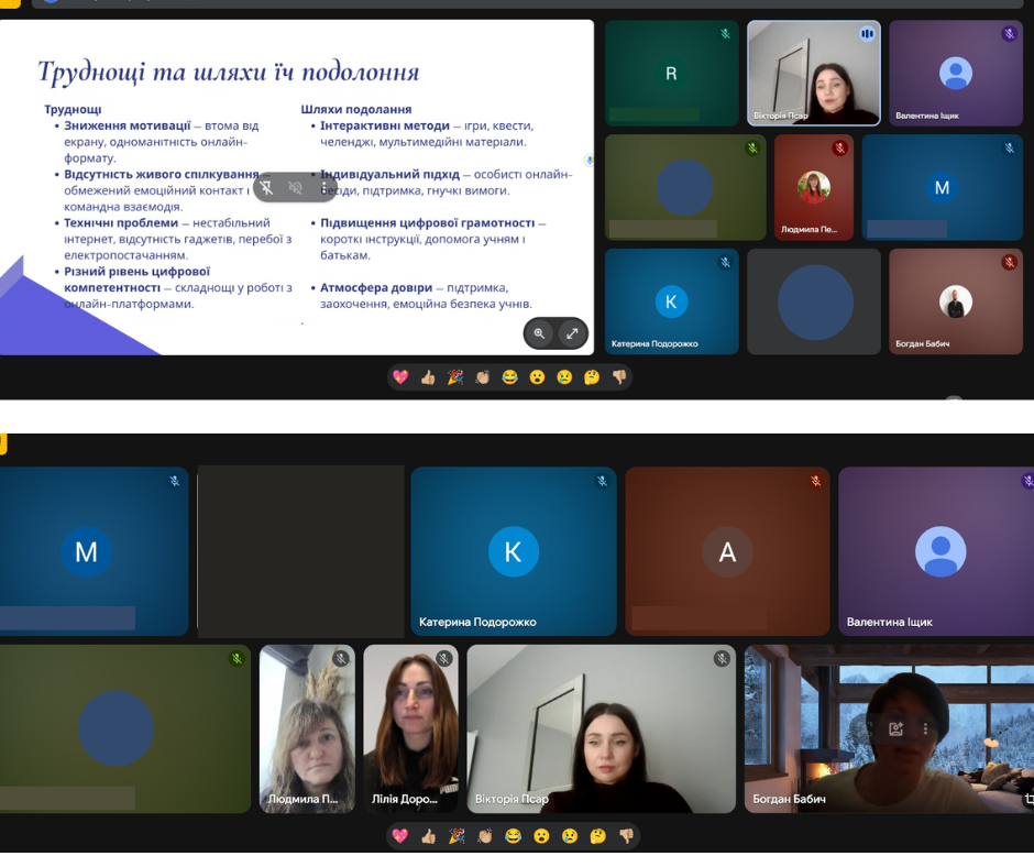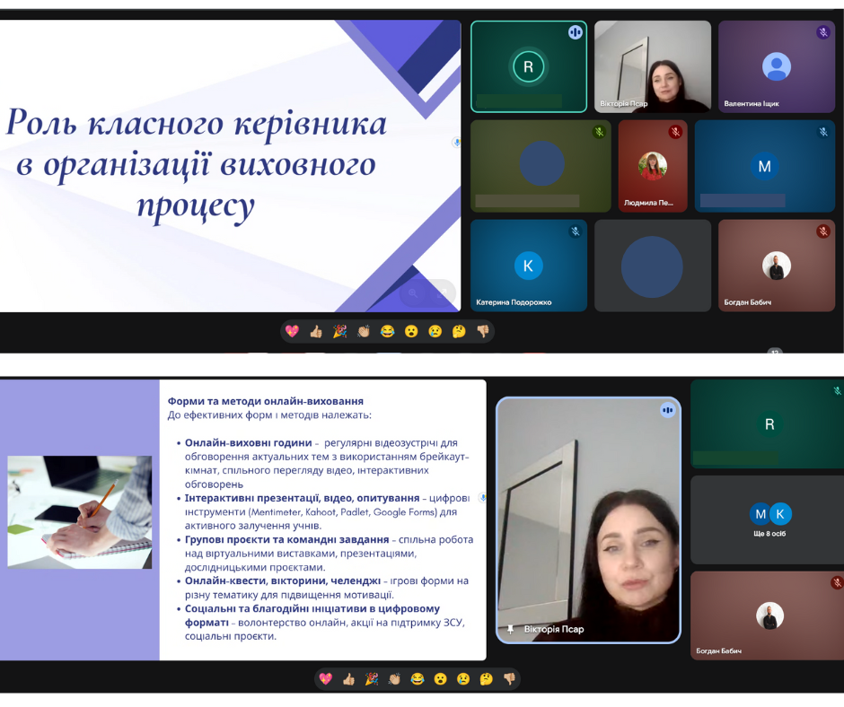 Окрему увагу приділили питанням національно-патріотичного виховання, формуванню безпечного освітнього середовища, профілактиці правопорушень та підтримці психологічного стану здобувачів освіти. З доповіддю “Роль класного керівника в організації виховного процесу” виступала Псар Вікторія Владиславівна.