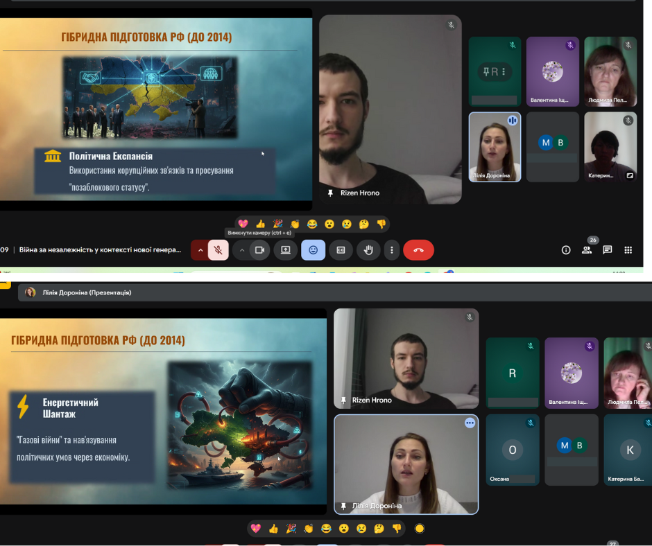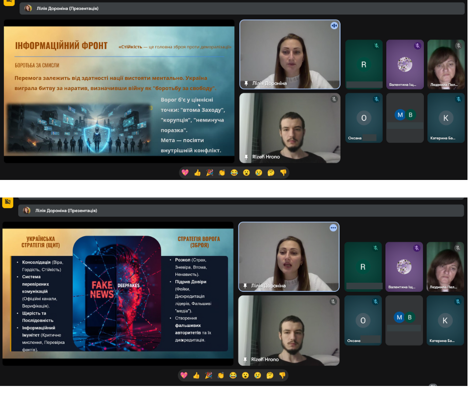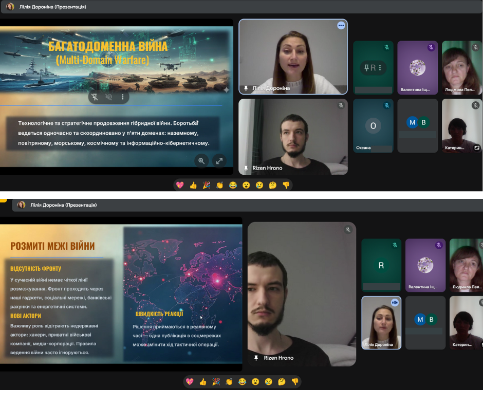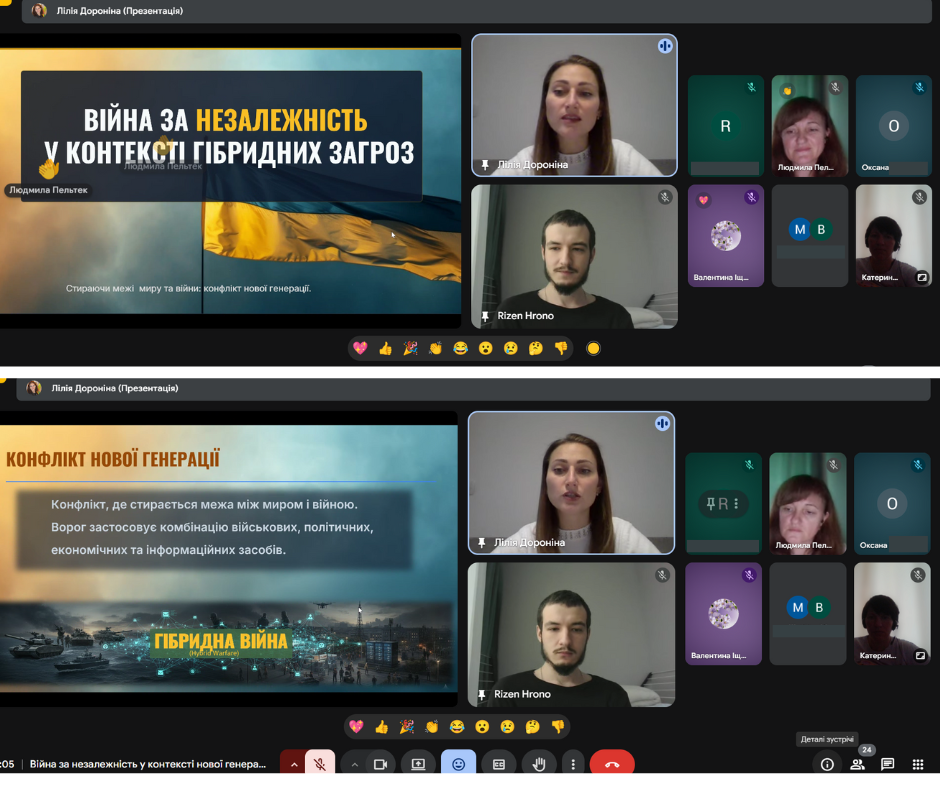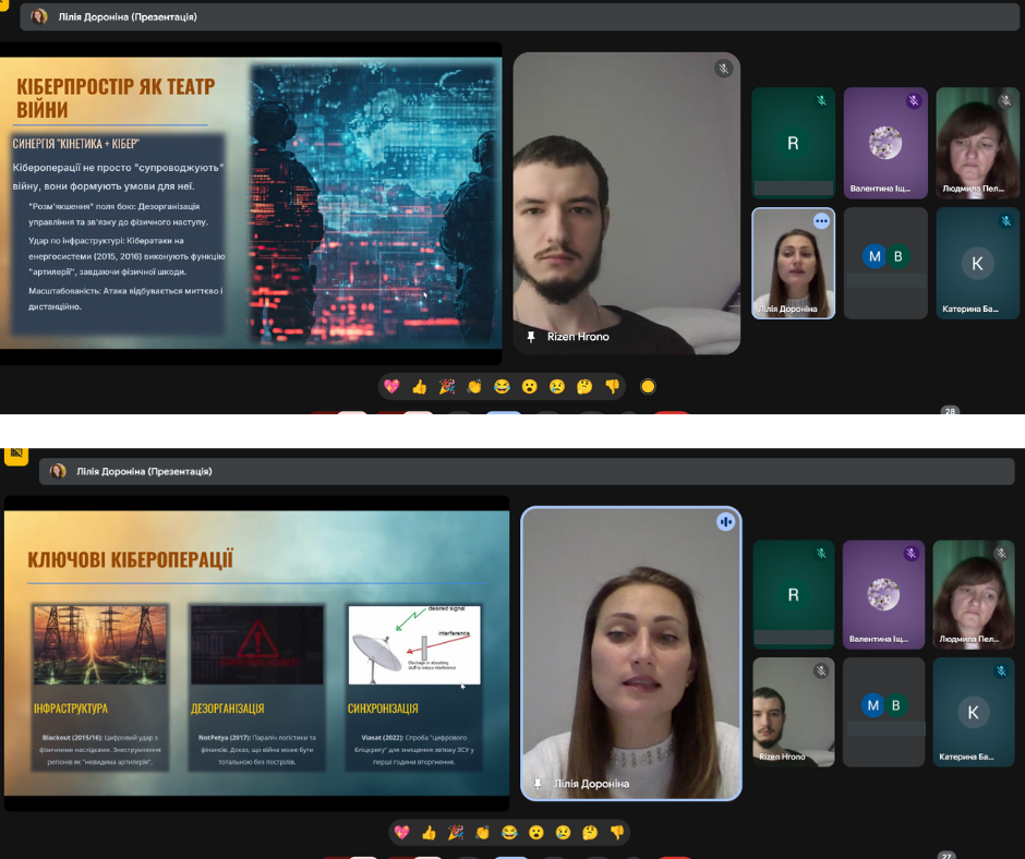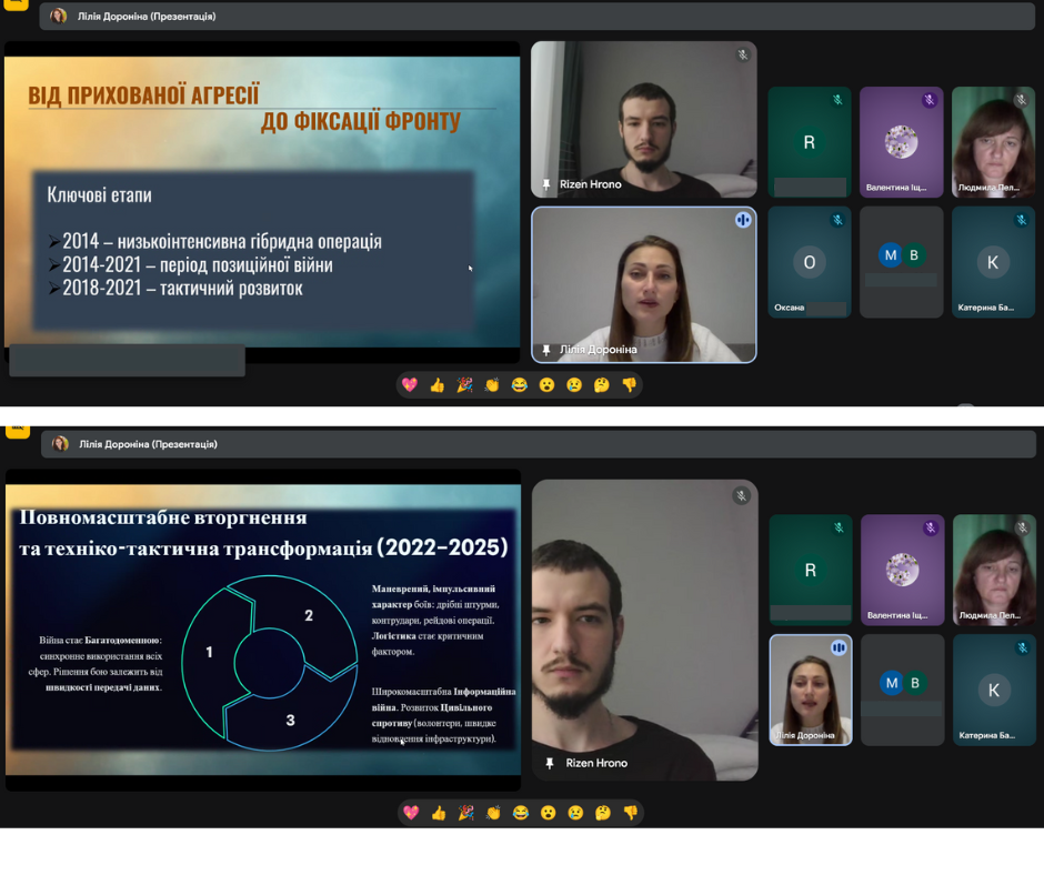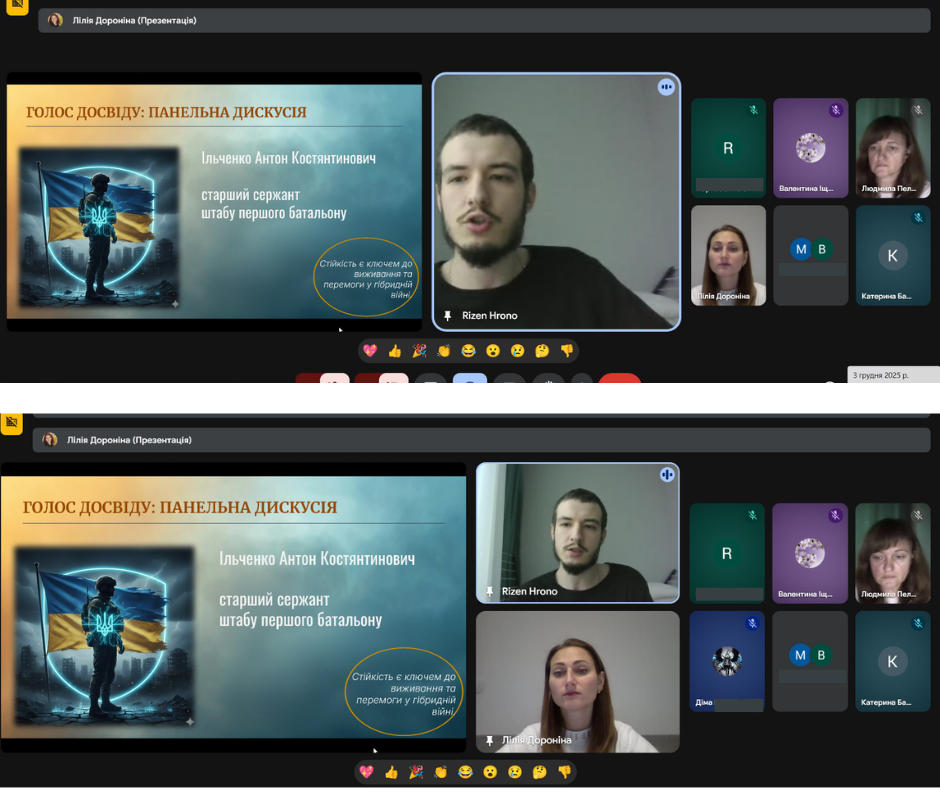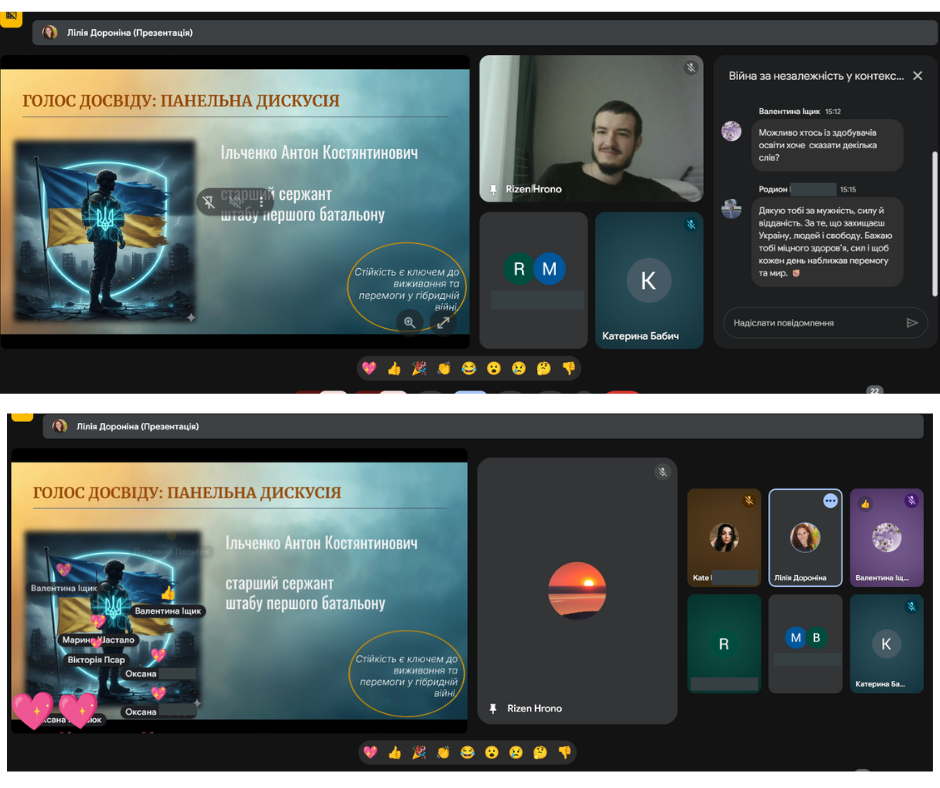 З метою формування у молодого покоління активної громадянської позиції, розвитку патріотичної свідомості та вшанування подвигу Захисників та Захисниць України, в ДНЗ «Бердянський машинобудівний професійний ліцей» було проведено онлайн зустріч “Війна за незалежність у контексті гібридних загроз”. Під час заходу організаторка зустрічі, викладачка ліцею Дороніна Лілія Іванівна ознайомила здобувачів освіти з особливостями ведення сучасної багатодоменної війни, зокрема взаємодії військових, інформаційних, кібернетичних та дипломатичних складових, приділила увагу питанням кібербезпеки та інформаційного протистояння в умовах гібридної агресії, а також запросила до слова гостя – діючого військового, випускника нашого закладу освіти, старшого сержанта Штабу першого батальйону Ільченко Антона Костянтиновича. Під час розмови він поділився власним досвідом, відкривши для нас не лише сувору реальність війни, а й теплі, людяні моменти, які підтримують наших захисників у найважчі дні. Серед розповідей були й зворушливі історії побратимства, і навіть забавні випадки з фронту — ті, що дозволяють зберігати світло всередині, попри всі випробування.